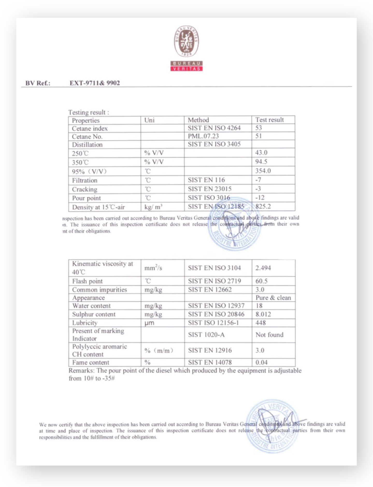 The quality of PRT™ processed diesel fuel has been evaluated by the best certification organization from Switzerland, Bureau Veritas. The product is suitable for modern EURO 6 electric generator sets, fuel type EN 590, and at the same time even “greener” then competitive fossil fuel, as well. For more details, see PP8 WP.